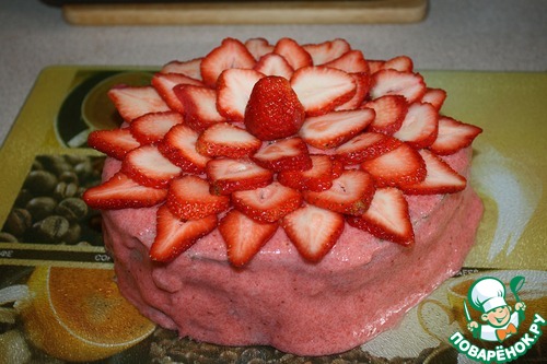 Торт по бокам и сверху обмазываем муссом и украшаем свежей клубникой.