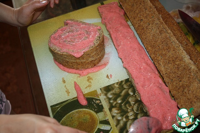 • Бисквитную полосу промазываем муссом и сворачиваем по спирали и т. д. по нарастающей собираем в торт