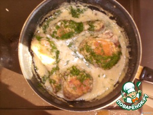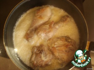 Когда куриные окорочка слегка обжарятся, добавить мело рубленый чеснок(у меня был готовый в пакетике), сыр и воду.