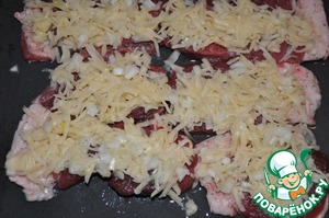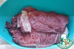 Мясо режем на порционные куски, хорошо отбиваем, солим, перчим и оставляем примерно на полчаса (можно и подольше).