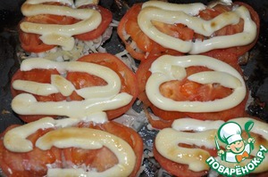Сверху добавляем майонез и ставим в разогретую до 180 градусов духовку.