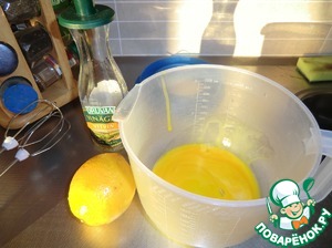 Начнём с майонеза. Отделить желтки от белков. Добавить лимонный сок и винный уксус. Размешать.