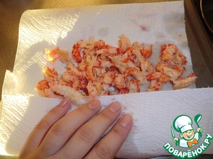 Займёмся раковыми шейками. Сливаем воду и выкладываем шейки на бумажное полотенце. Отжимаем, чтобы шейки были практически сухими.