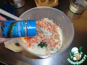 Кладём шейки, лук и укроп в майонезный соус, солим, перчим. Перемешиваем.