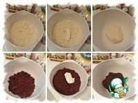 Готовые бисквиты полностью остудить. Со светлого бисквита срезать корочки. Оба бисквита измельчить в крошку блендером или руками. По немногу добавить сливочный сыр и смешать его с крошкой до состояния пластилина.