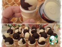 Примерно в равном количеcтве взять шоколадную и светлую массу и скатать шарик, примерить его к вафельному стаканчику. Шарик должен быть по диаметру чуть больше диаметра стаканчика. Кстати о стаканчиках, если в магазинах у вас такие не продаются, то можно испечь в вафельнице маленькие коны.