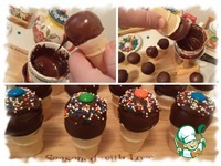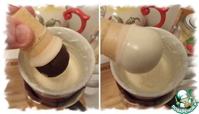 Когда шоколад застынет окунуть шарик ещё раз в растопленный шоколад, но не полностью, а только верхушку для того что бы получился эффект подтаявшего мороженого.