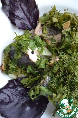 [+4]Из зелени также взяла петрушку и укроп (базилик для украшения использован), а из специй - перец чёрный и душистый горошком и имбирь свежий. Весьма ароматное блюдо, рыба получается не сухой. Спасибо за рецепт!