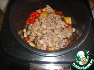 Затем немного подсаливаем, перчим, добавляем мясо, вино, закрываем крышку. Выставляем программу Тушение, Овощи, 40 минут и идем заниматься своими делами. -