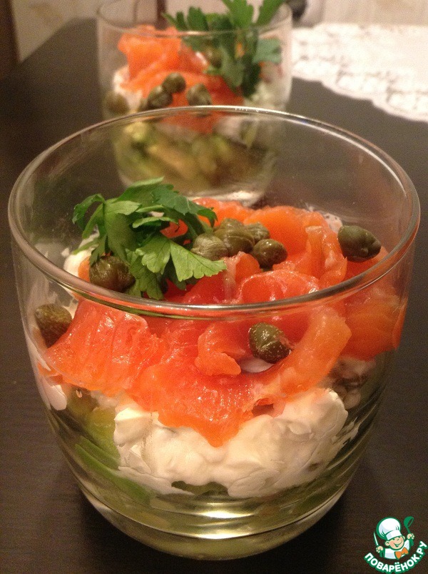 Салат-коктейль из лосося, авокадо и творожного крема. Вкусный, быстрый и эффектный салат-коктейль из слабосоленого лосося, авокадо и творожного крема. Готовится за пять минут.