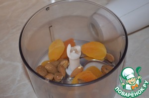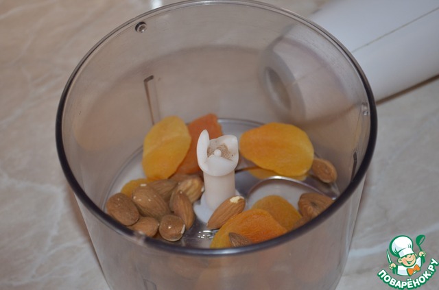 При помощи блендера измельчите курагу и миндаль. Потом добавьте овсяное печенье и хорошенечко измельчите, добавив 1 столовую ложку растворимого кофе уже из готового напитка.