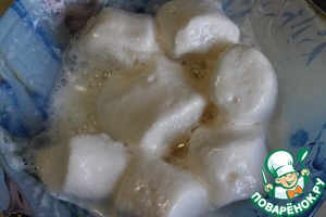 Суфле маршмеллоу с добавлением молока разогреть в микроволновке в течение 1 минуты. Суфлешки увеличатся в 3 раза и станут пушистые