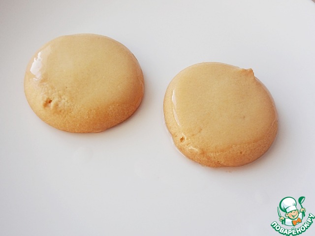 Разложите печенья, смочите их сиропом от абрикос или лимонным соком. Немного подождите, чтоб сироп пропитал печенье.