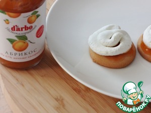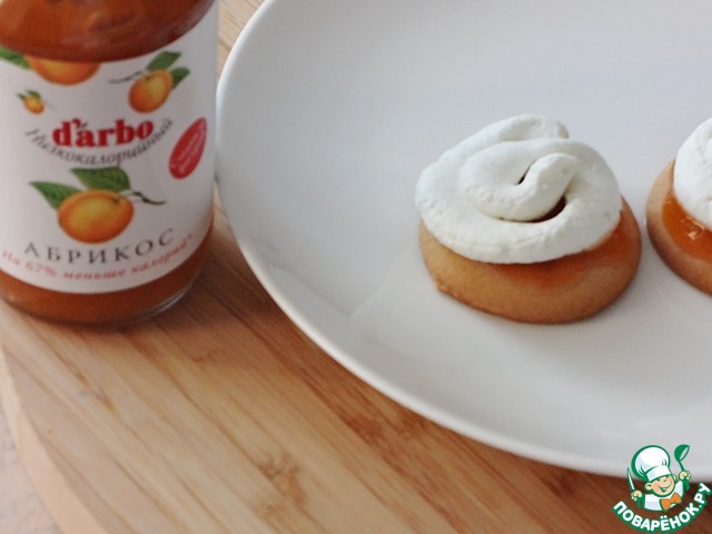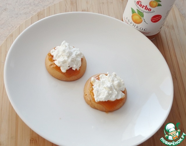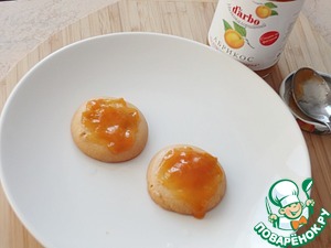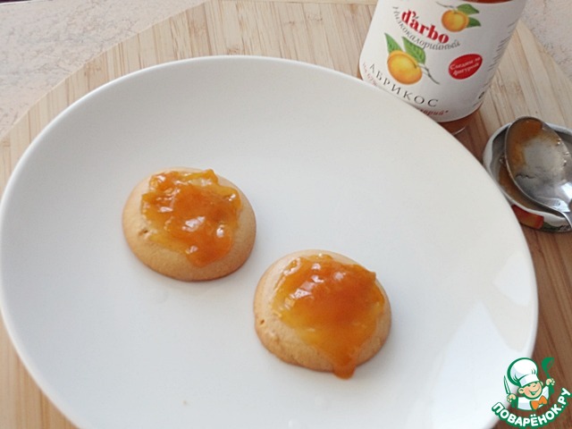 Положите немного абрикосового конфитюра D'arbo на печенье тонким слоем (примерно по половине чайной ложки).