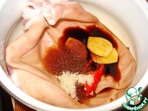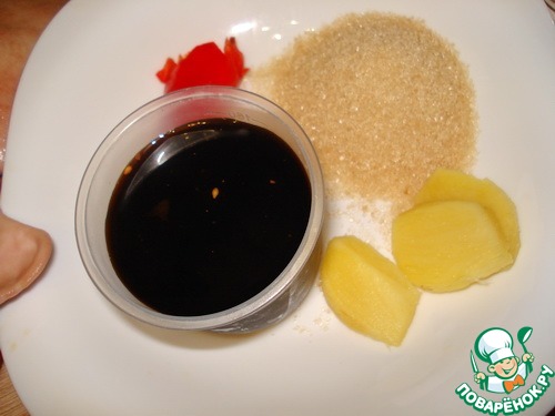 Для варки ушей нам понадобится: соевый соус Kikkoman, имбирь, тростниковый сахар и немного перца чили.