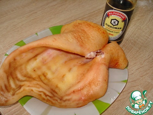 Ставим вариться. Добавляем соевый соус Kikkoman, имбирь, перец чили и сахар. Заливаем водой, чтобы ухо было полностью в воде, и варим до готовности ( у меня варились примерно 1 час 30 минут).