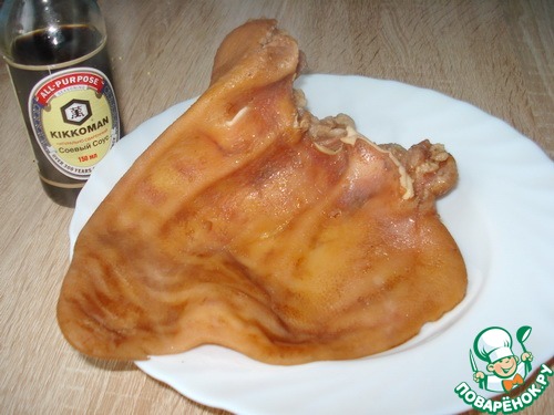 Свиное ухо промыть, почистить и замочить в холодной воде на на час. Снова промываем и хорошенько скребем ножом.