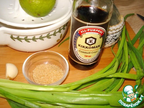В миске смешиваем чеснок, зеленый лук, добавляем соевый соус, оливковое масло, сахар и сок лайма. Хорошо перемешиваем - соус готов. -