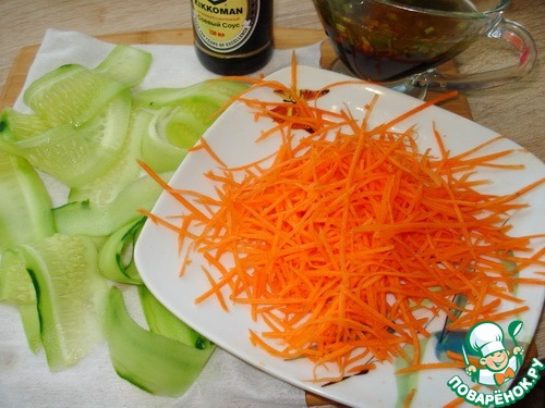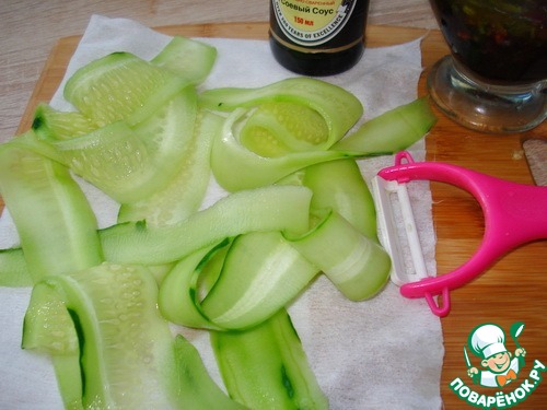 Очищаем огурец. Нарезаем длинными пластинами с помощью овощечистки. Выкладываем на салфетку, чтобы убрать лишнюю жидкость.