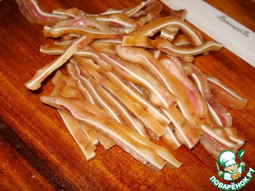 Нарезаем остывшее свиное ухо тонкой длинной соломкой.