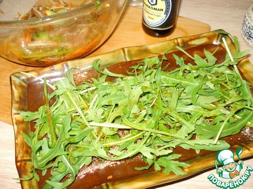 На сервировочное блюдо выкладываем рукколу, поливаем немного оставшимся соусом.