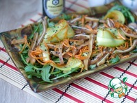 Выкладываем в миску свиное ухо, добавляем морковь, добавляем огурец, заправляем соусом (немного соуса оставьте для рукколы).