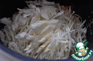 Добавляем нарезанную соломкой капусту и продолжаем помешивать. Капуста должна не обжариться, а как бы слегка подвариться.