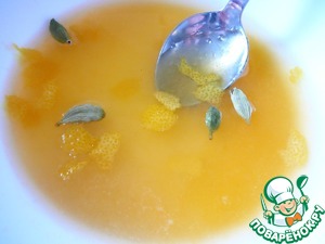 Готовим цитрусовую заливку. Отжимаем апельсиновый сок, смешиваем его с медом, лимонной цедрой, лимонным соком, сахаром, добавляем семена кардамона. Прогреваем массу. Как только закипит, готова.