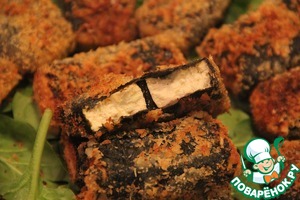 2. Полоску нори смазываем водой и заворачиваем в неe плотно кусочек тофу.