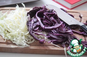 Мелко шинкуем белую и красную капусту.