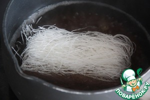 Снова доводим воду с соевым соусом до кипения и отправляем в нее фунчозу.