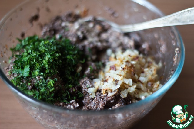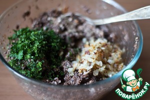 Выложить жареный лук в грибную массу, добавить мелконарезанную зелень петрушки и укропа, соль, перец. Перемешать до полного соединения ингредиентов.