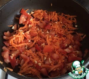 3. На оливковом масле пассируем несколько минут в сковороде чеснок, морковь и помидоры.