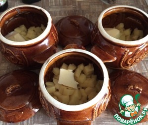5. Пока тушатся овощи, режем мелкими кубиками картофель. Выкладываем порционно в горшочки, сверху кладем по небольшому ломтику сливочного масла. Соль, перец по вкусу.