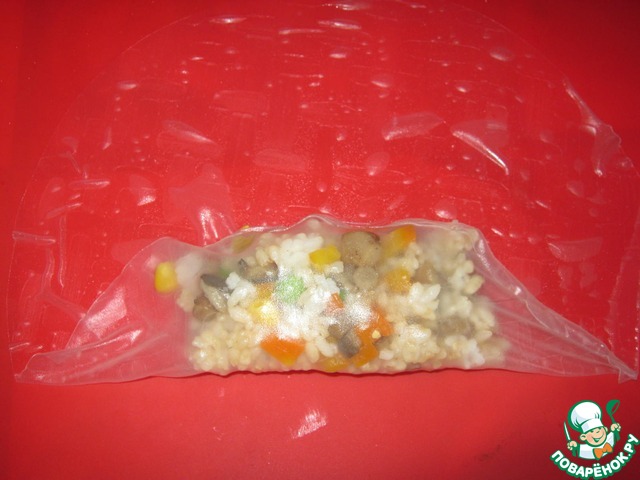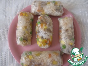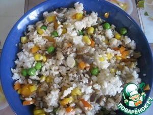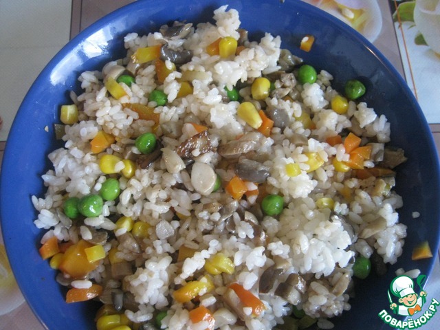 Добавить к рису горошек и кукурузу ( предварительно сварила в микроволновке), обжаренные грибы, вареную морковь, нарезанную мелким кубиком. Полить соевым соусом.