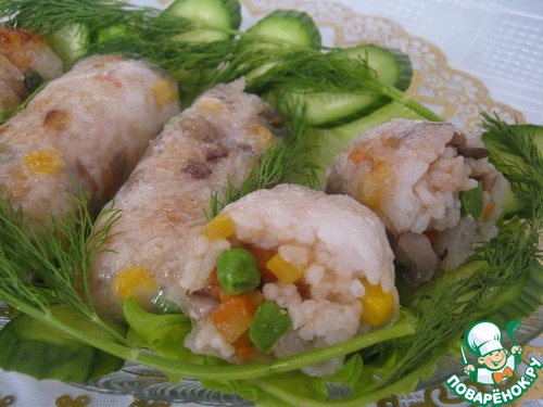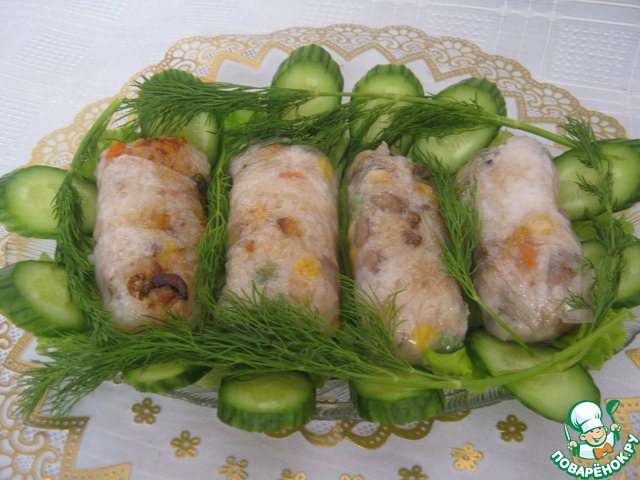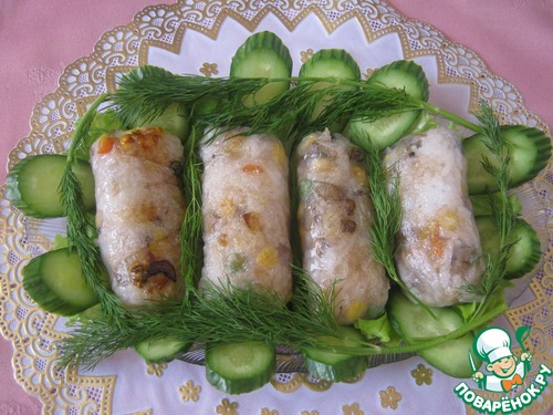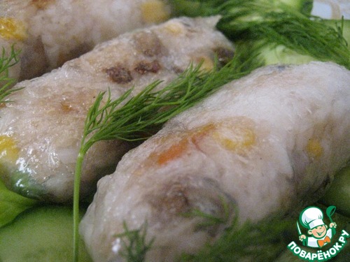Берём лист рисовой бумаги, замачиваем на 15 секунд в теплой воде, выкладываем на ровную поверхность, промакнуть излишки воды полотенцем. На край листа кладём начинку и заворачиваем как фаршированный блинчик.