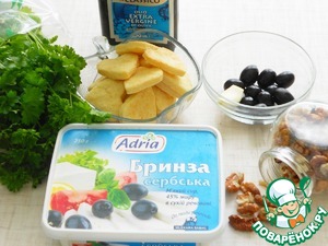 6. Маслины, чеснок, орехи и петрушку мелко нарезать. Все соединить и добавить масло, перемешать.