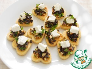 На печенье выкладывать немного овощно-ореховой смеси, а сверху выложить по кубику сыра. -