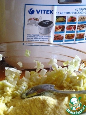 Натереть сыр на мелкой терке, смешать его с сухарями. За 10 мин. до окончания программы распределить сыр на нашем пироге.