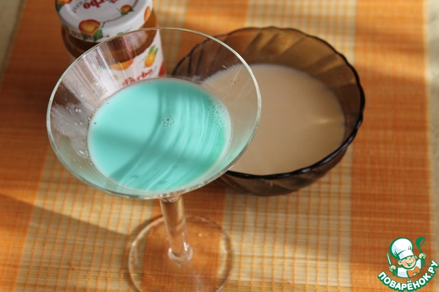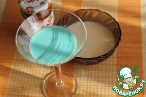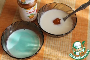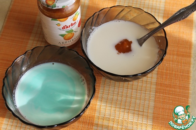 Разделить молоко с желатином на 2 части. В одну добавить абрикосовый конфитюр, в другую - мятный сироп