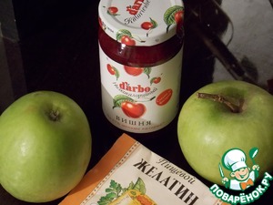 Пока яблоки остывают готовим желе. Для этого желатин заливаем холодной, кипяченой водой. Через 15 мин. на водяной бане распустить желатин и добавить конфитюр. Перемешать. Готовое желе разлить по печеным яблокам, положить крышки и поставить в холодильник на несколько часов до застывания. Украсить на Ваше усмотрение.