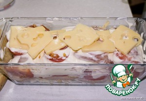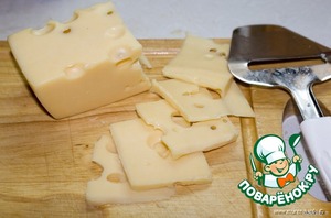Сверху трём сыр на крупной тёрке и укладываем кусочек помидорки.