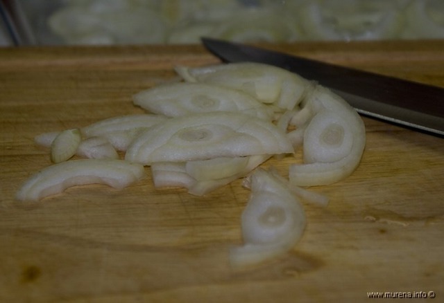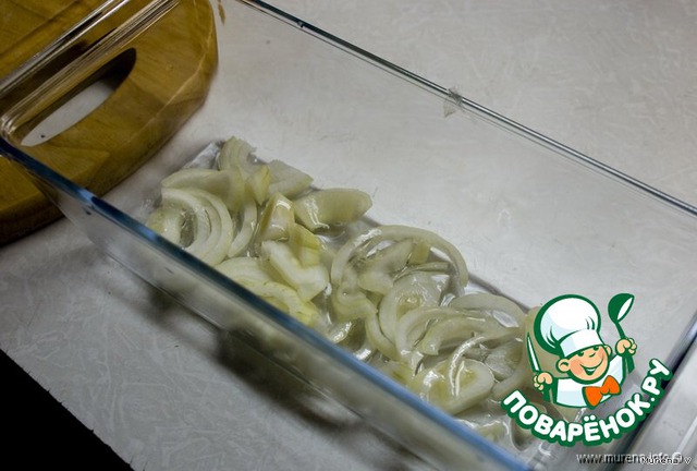 Лучок нам нужен только для укладки на донышко жаропрочной посудинки. Вот укладываем и поливаем совсем немножко маслицем