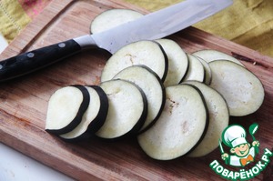 Баклажан помыть и нарезать тонкими кружками. Залить ледяной водой и оставить на 5-7 минут.