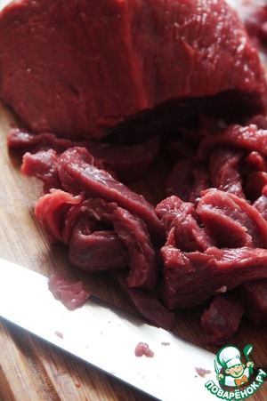 Говядину (очень важно брать мягкую часть - вырезку или мякоть) нарезать тонкими ломтиками.