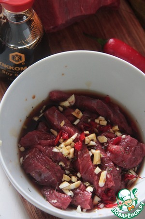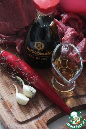 В глубокую пиалу налейте соевый соус, виски, добавьте мелко нарезанный чеснок, чили и тимьян. Все перемешайте и положите мясо в соус.