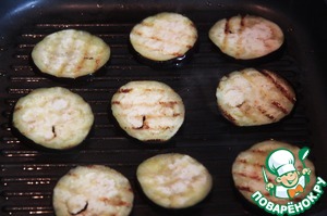 Разогрейте сковороду-гриль, добавьте немного оливкового масла и обжаривайте баклажаны с двух сторон.
