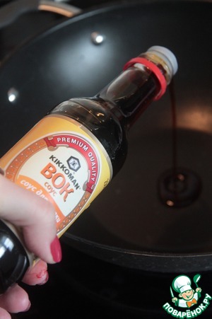 Если у Вас нет сковороды вок, то можно готовить на обычной сковороде, добавив немного оливкового масла. Если вы готовите в воке, то добавьте на теплую сковороду соус Киккоман для вок.