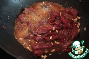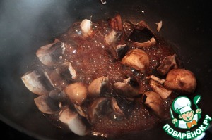 Снимите готовые грибы, а вместо них добавьте мясо, вместе с маринадом. Готовьте 10-12 минут до мягкости мяса.