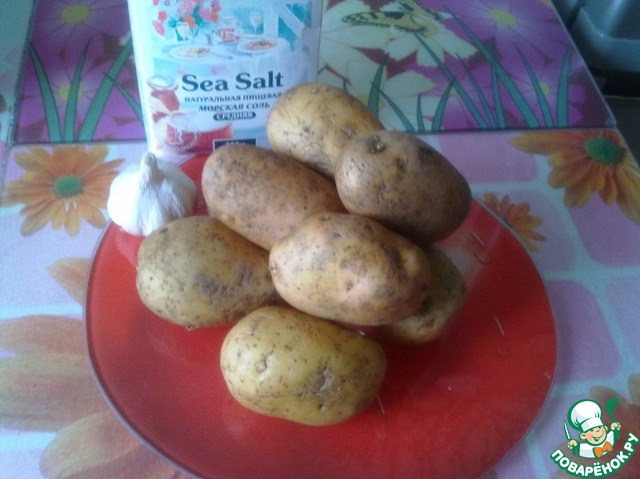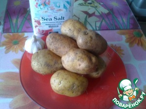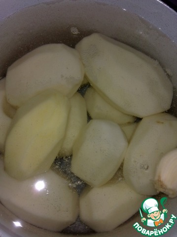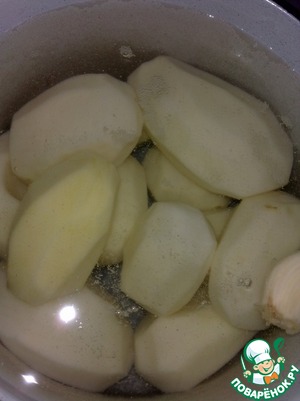 Сварите 5 картошин, с добавлением соли (по вкусу) и зубка чуть раздавленного чеснока до готовности.
